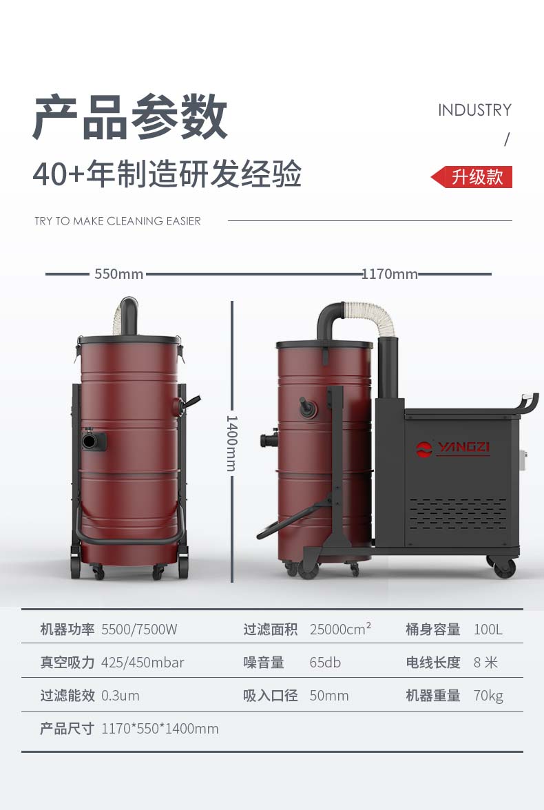 扬子YZ-C8工业吸尘器,厂家直销,省30%成本,电线长度:8M,重量:70kg,功率:7500W,大于10人工作效率,干净不留痕,免费试机,买贵包退.专业的售后团队,免费指导操作和维护.扬子YZ-C8工业吸尘器分:标准5500W款、标准7500W款、不锈钢款,想进一步了解,请咨询在线客服或拨打官方免费热线,客服详细解答产品参数和最新活动价格